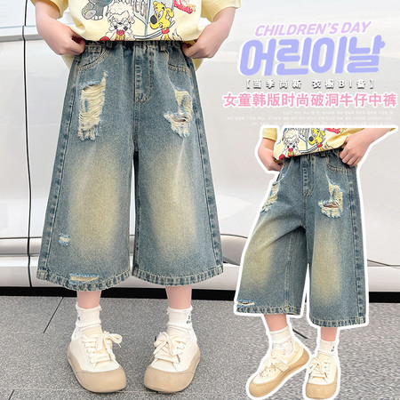 破洞牛仔中长裤夏装新款女童夏款